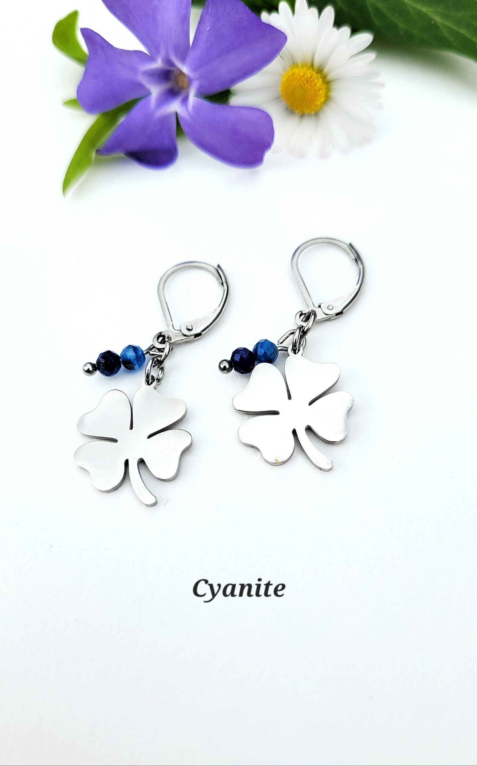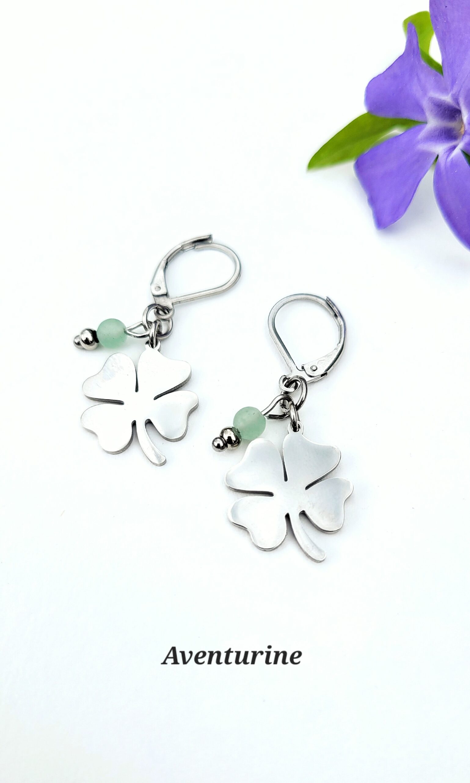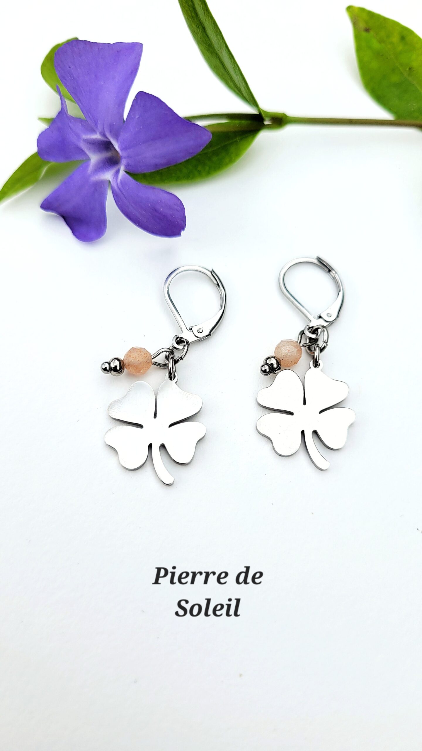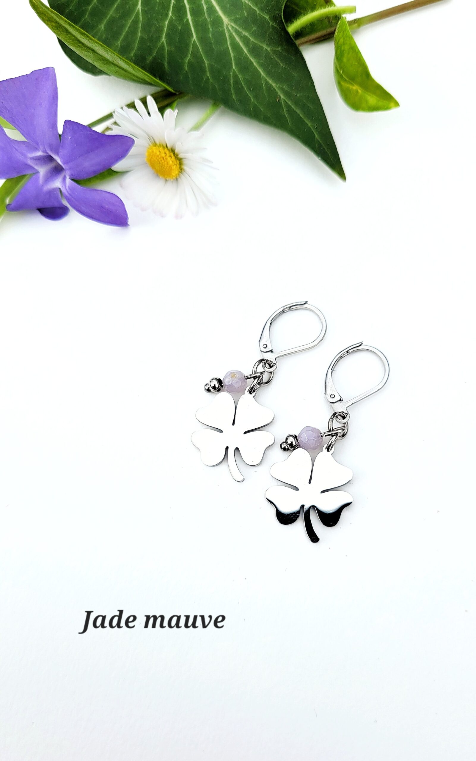 Boucles d’oreilles en forme de trèfle, accompagnées d’une pierre naturelle. Une touche douce et de symbolique à porter au quotidien.