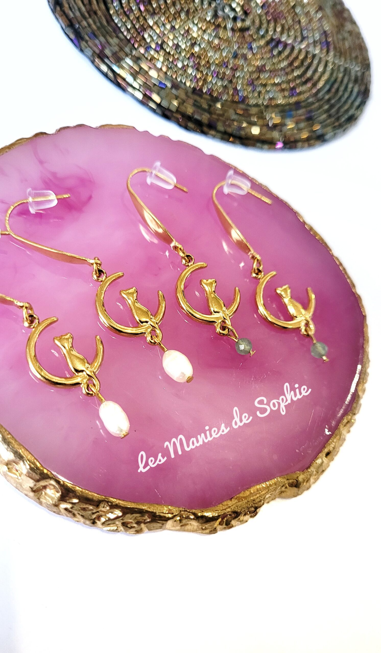 Bijou réalisé à partir d’un crochet, d’un pendentif représentant un chat sur une lune et d’une pierre naturelle.