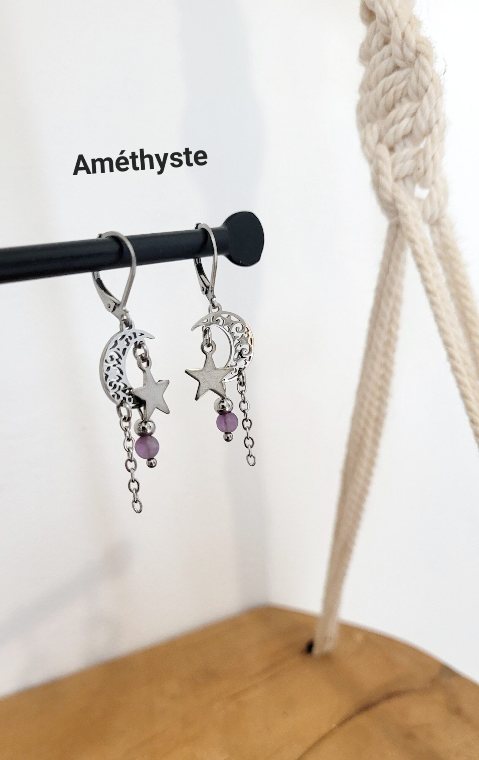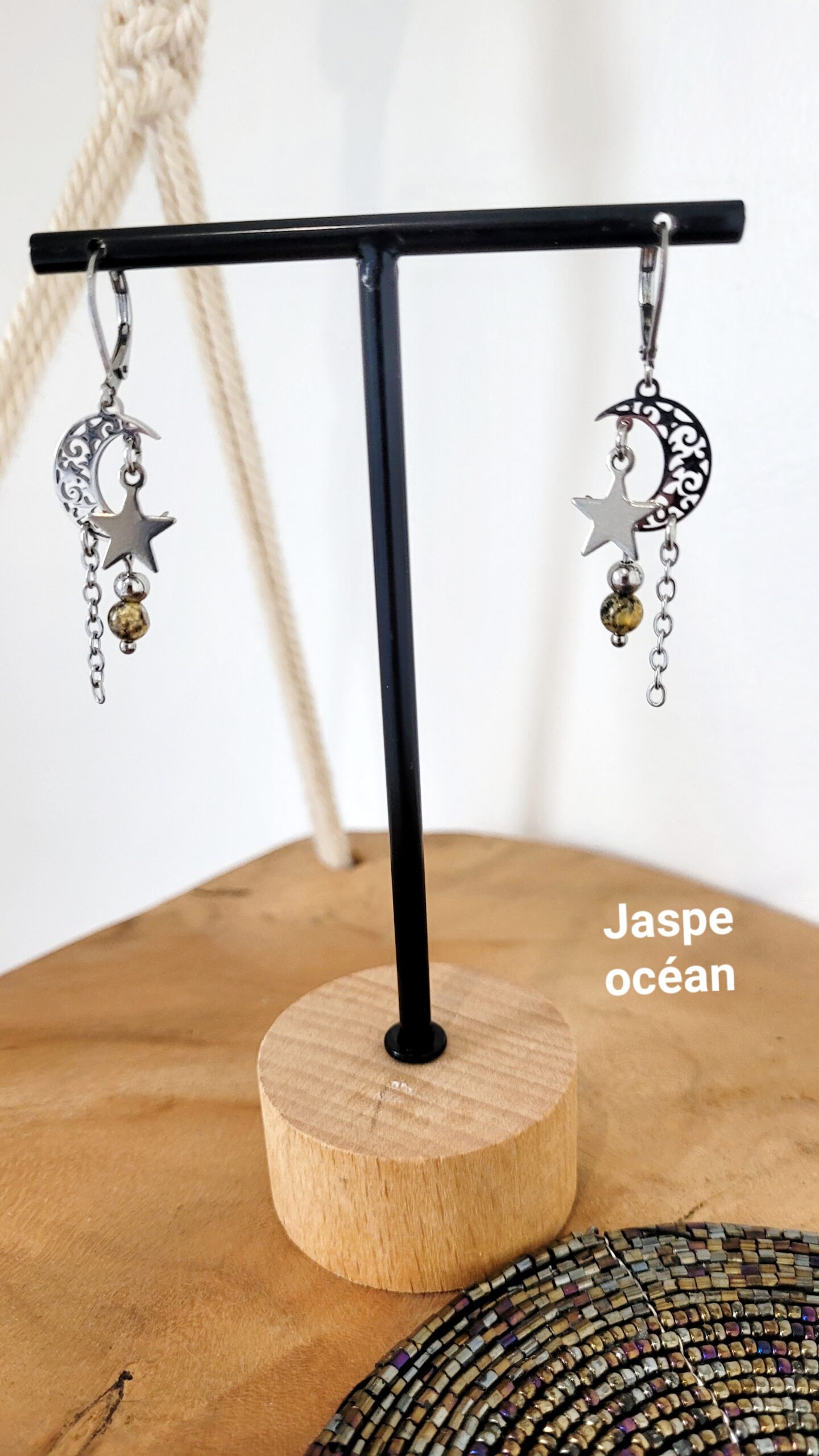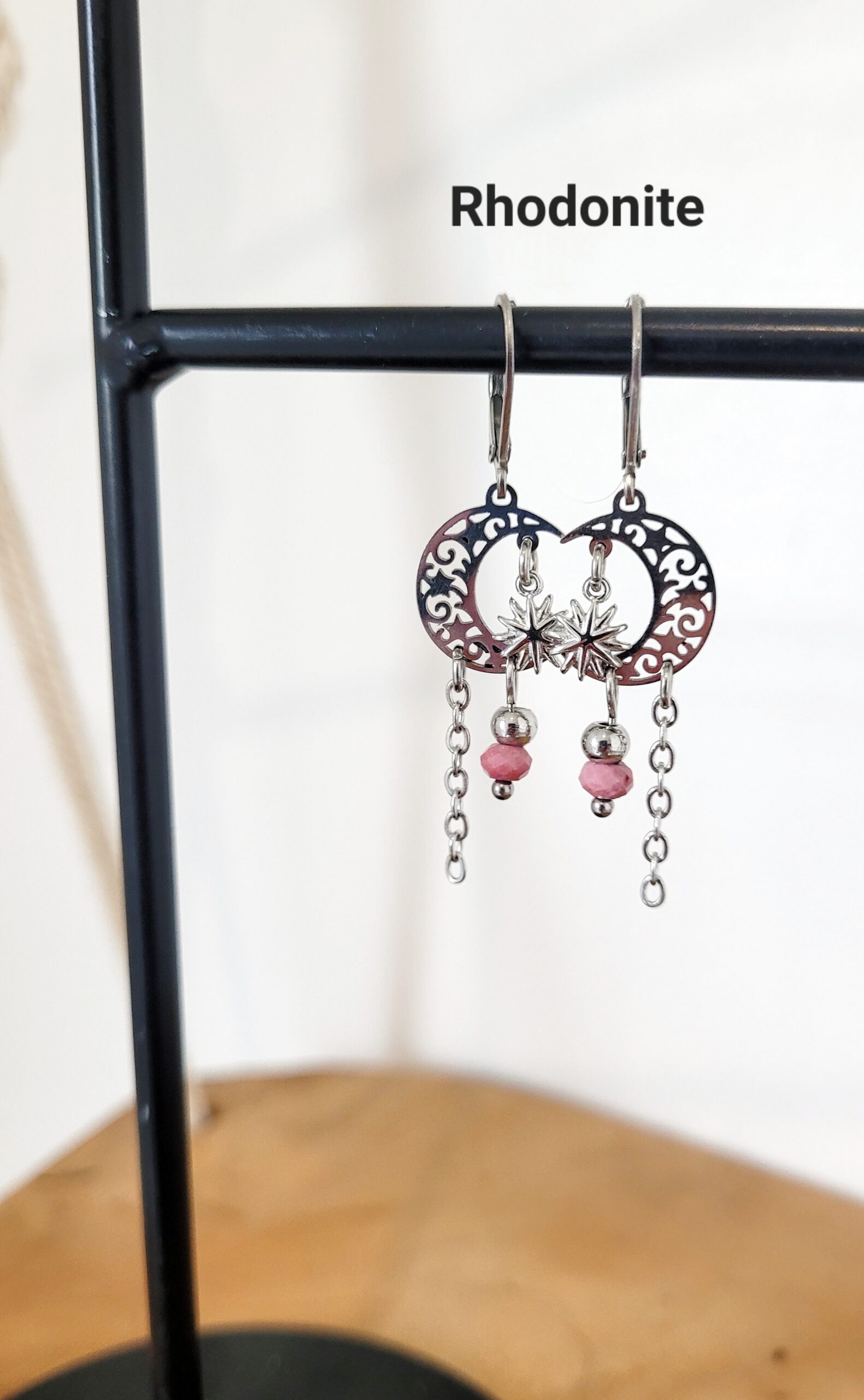 Ravissante paire de boucles d’oreilles de style bohème, réalisée à partir d’un pendentif en forme de lune, de pierre naturelle et d’une chaine fine.