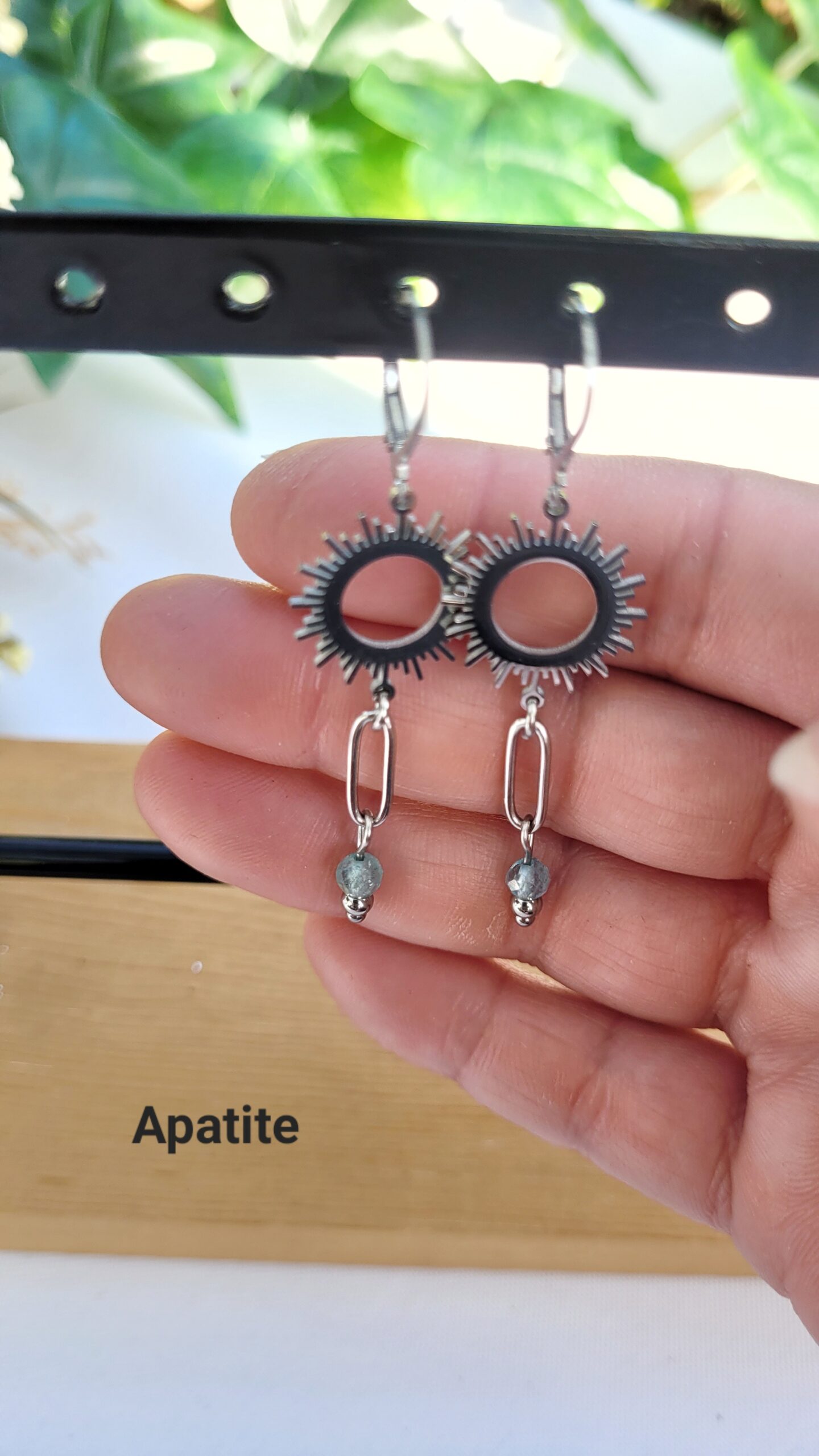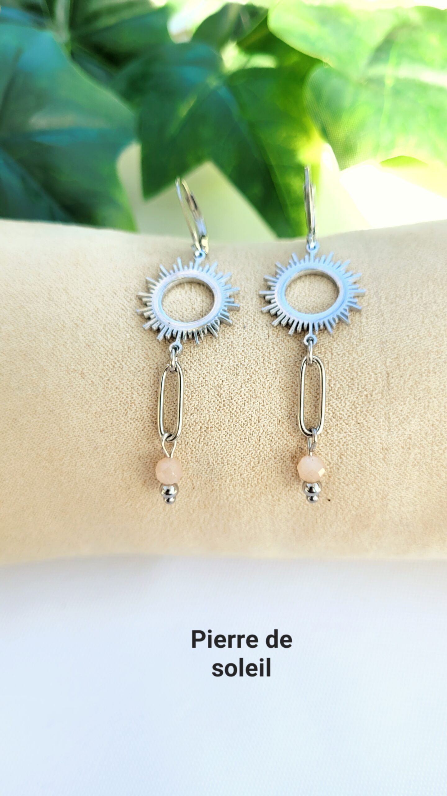 Ravissante paire de boucles d’oreilles réalisée à partir d’un d’un pendentif en forme de soleil, d’un gros maillon et de pierres naturelles.