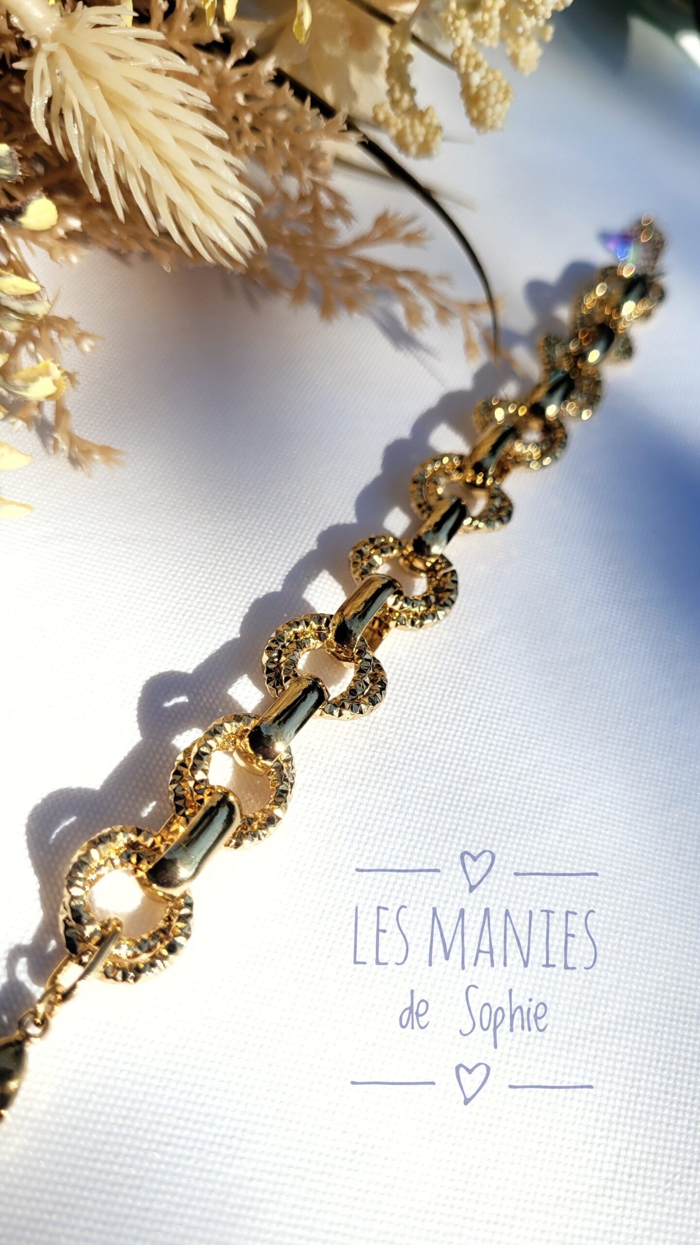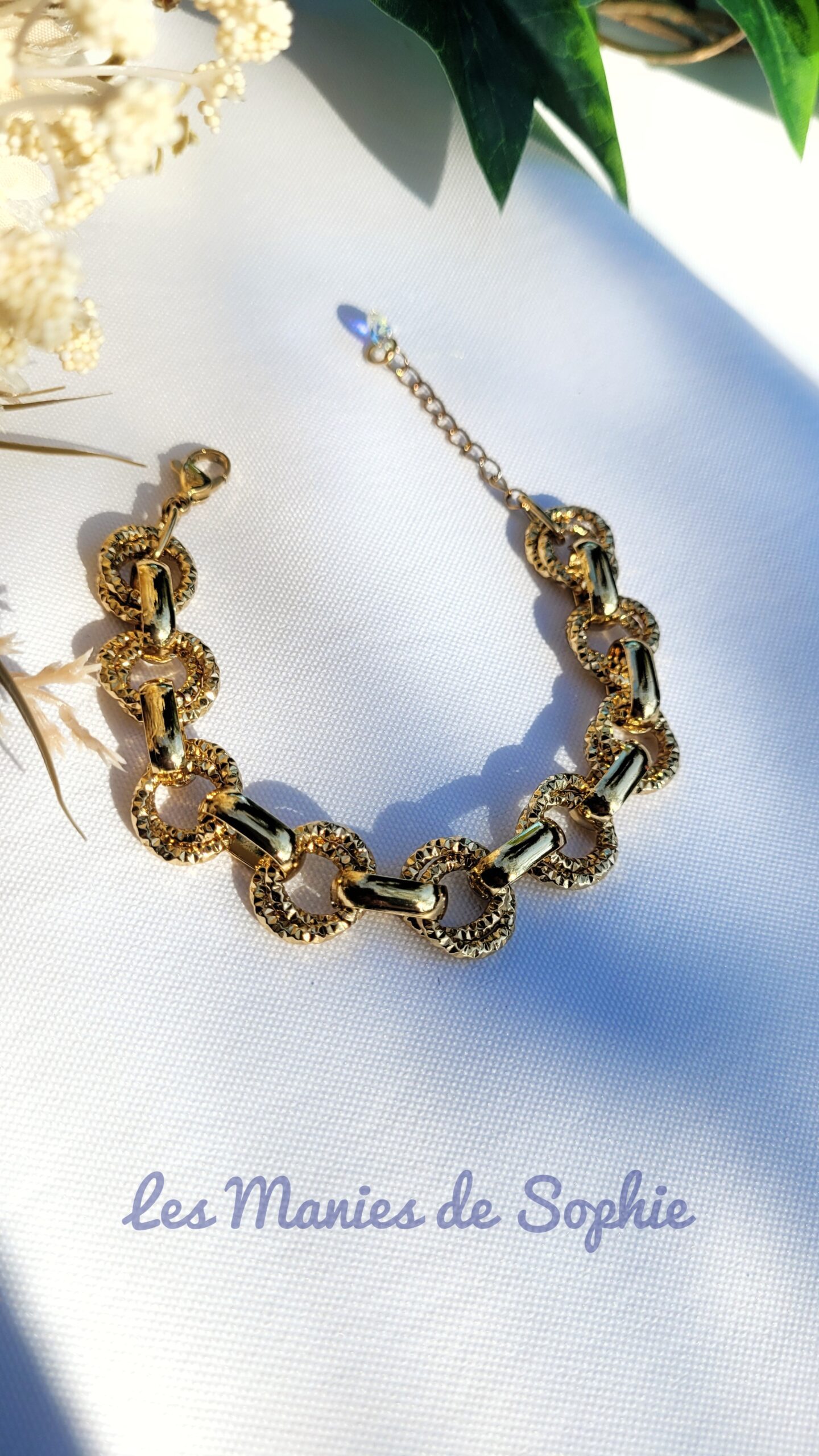 Bracelet tendance à grosses mailles diamantées et mates, à porter seul ou en accumulation avec d’autres bracelets.