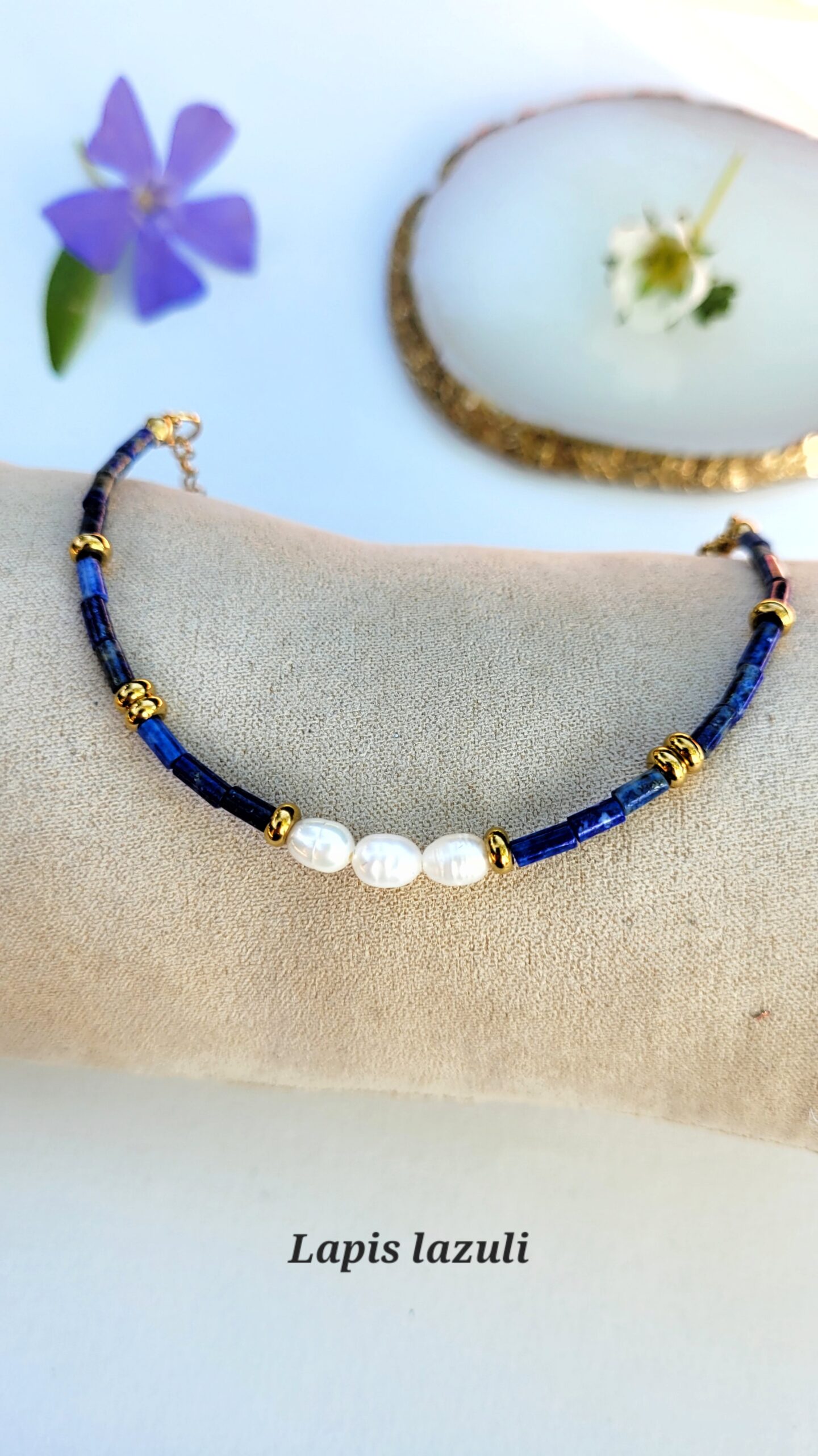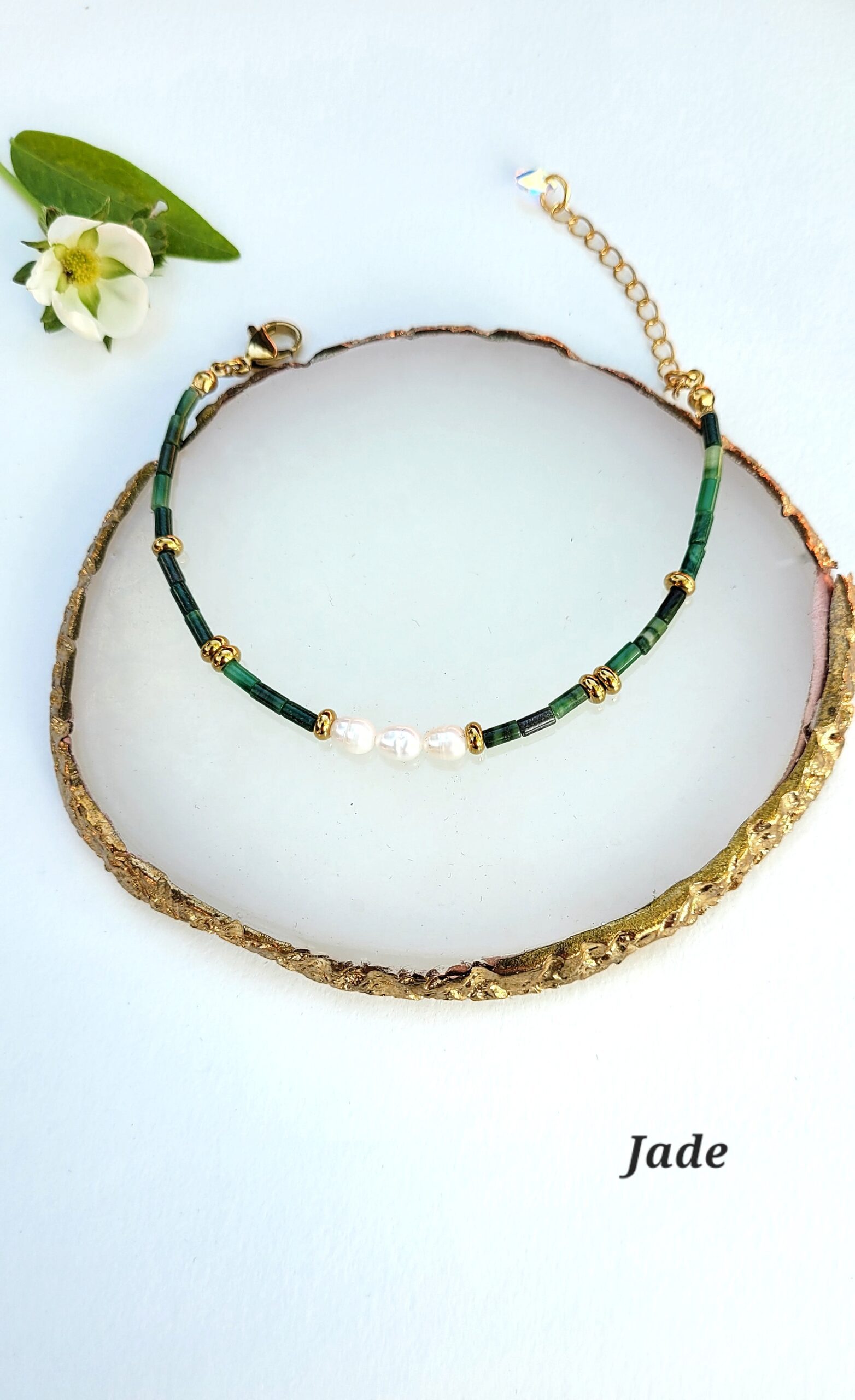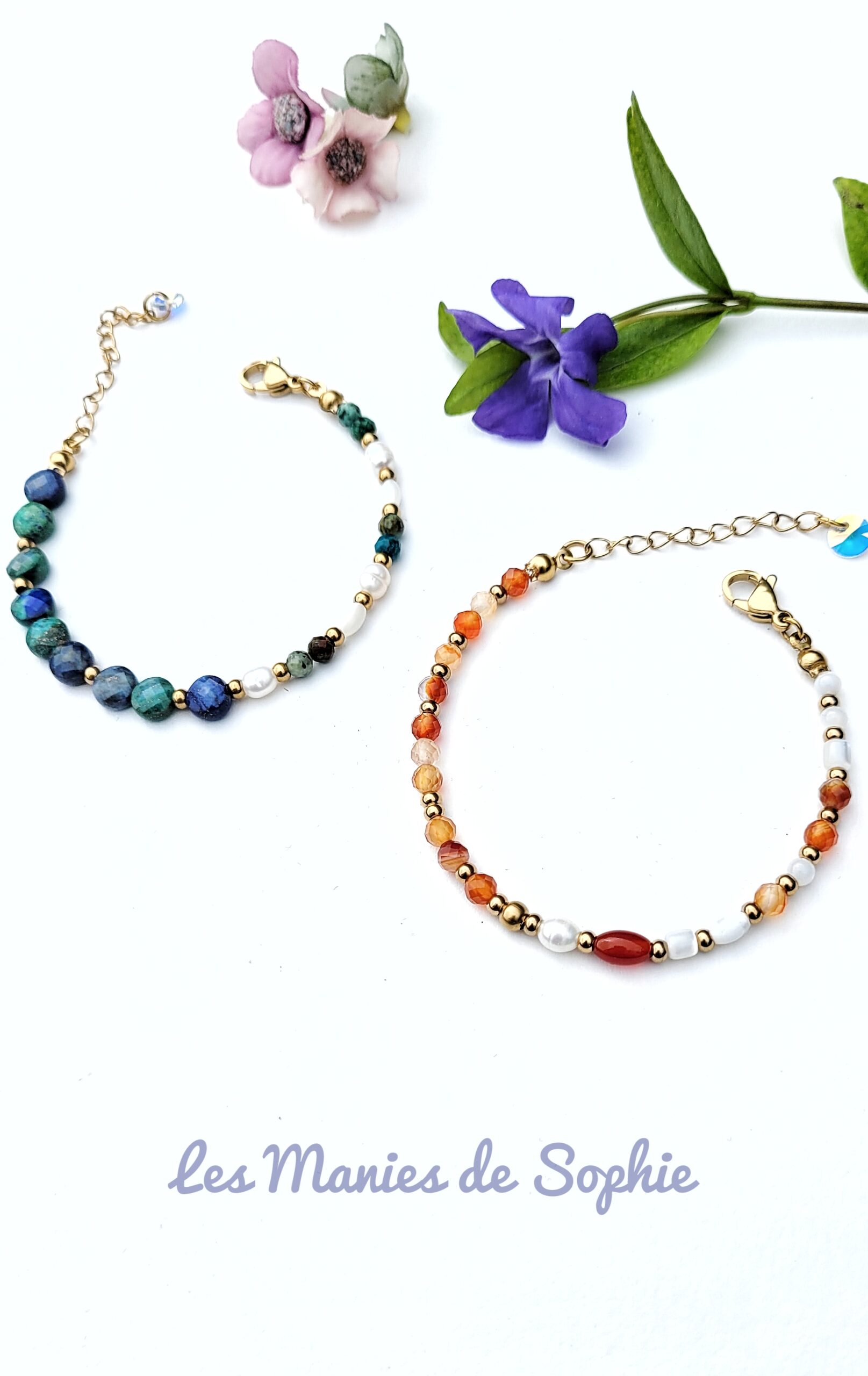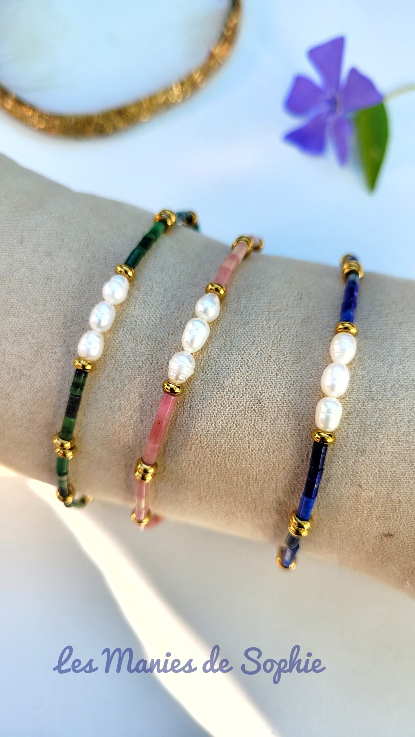 Bracelet en pierres naturelles et perles d’eau douce, au design fin. Une touche élégante qui habille le poignet en toute simplicité.