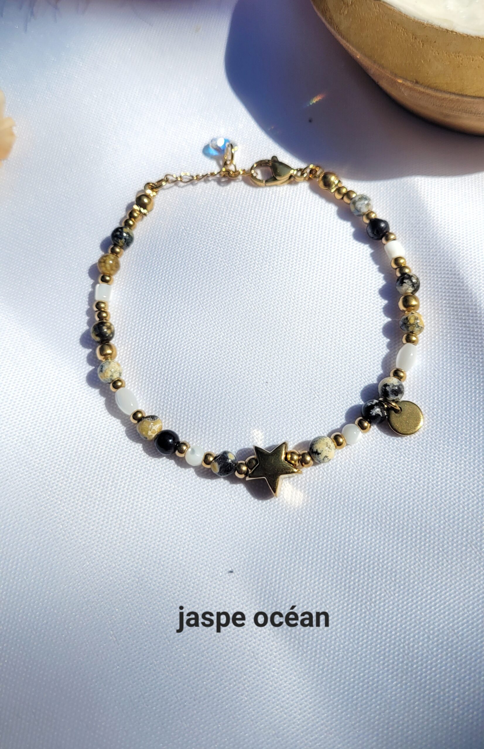 Magnifique bracelet réalisé à partir d’une perle en forme d’étoile , de pierres naturelles, de nacre et d’un petit pendentif sur le côté du bijou.