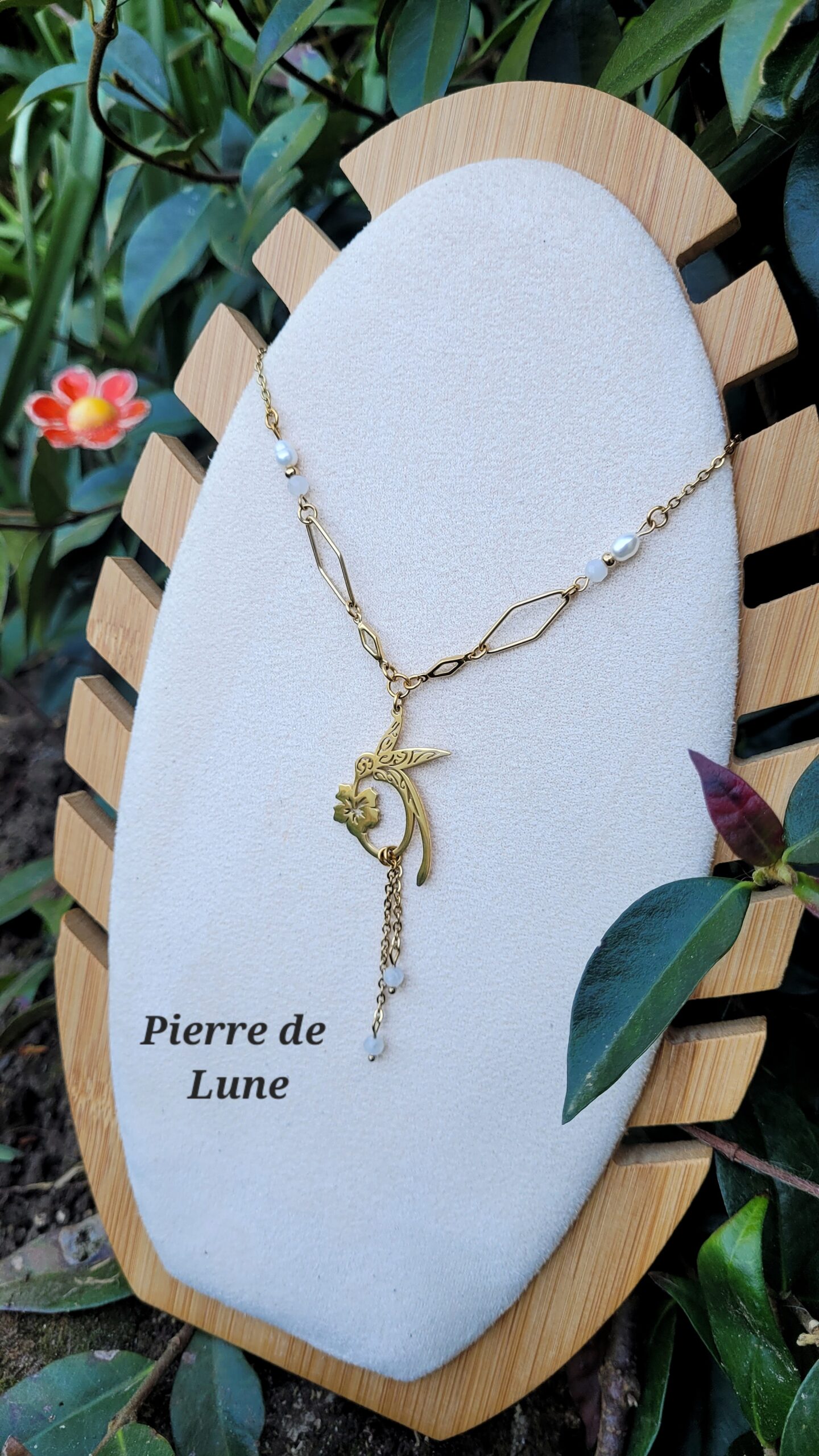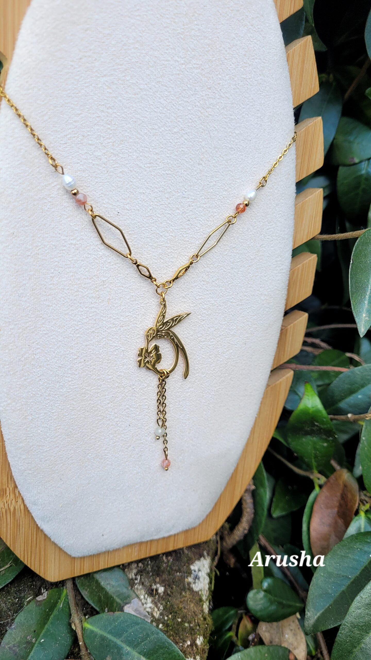 Réalisé à partir d’un pendentif en forme de colibri, de losange, de perles d’eau douce et de petites perles en pierre de lune d’Inde (blanc) ou arusha de Tanzanie (rose)