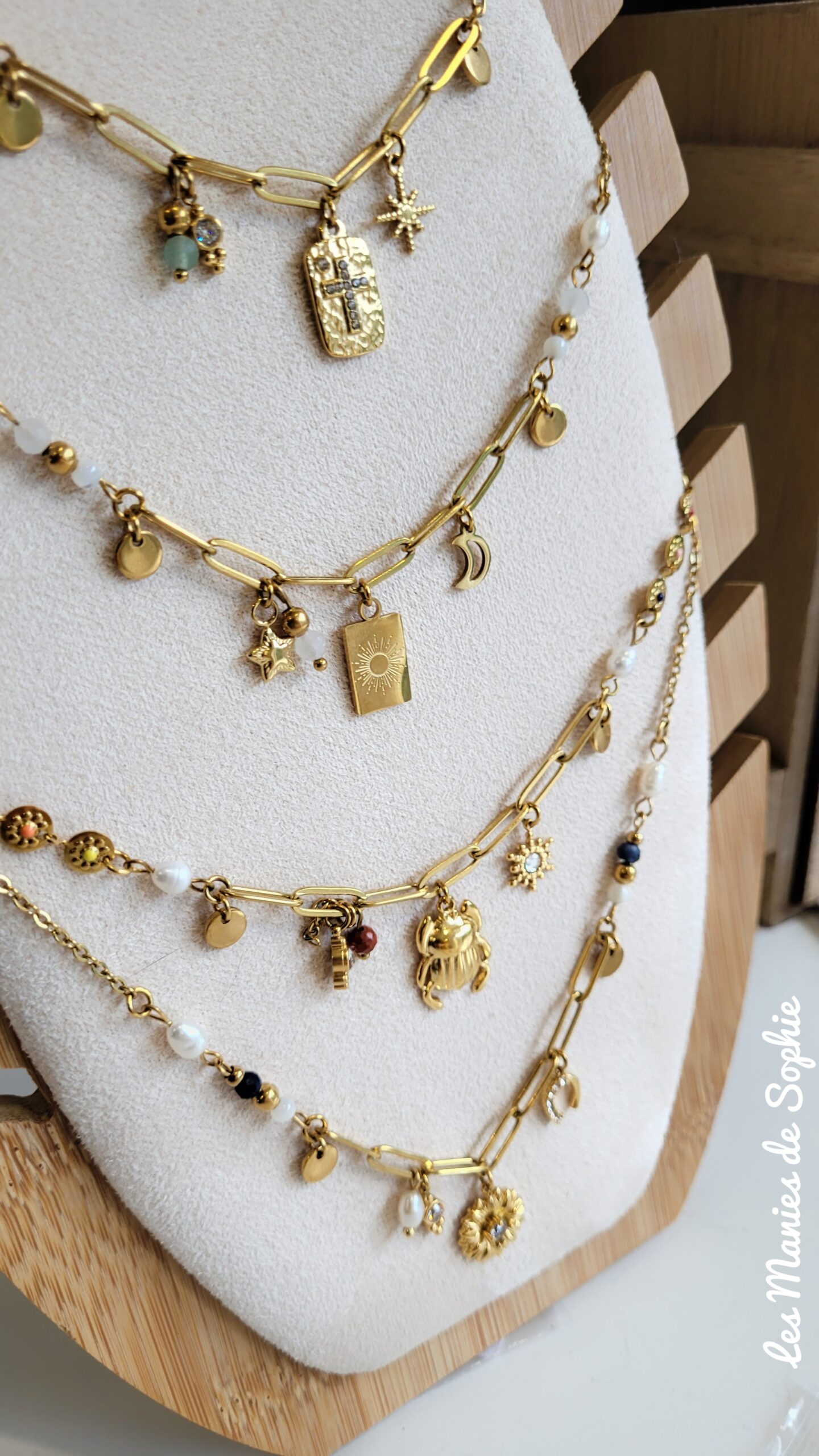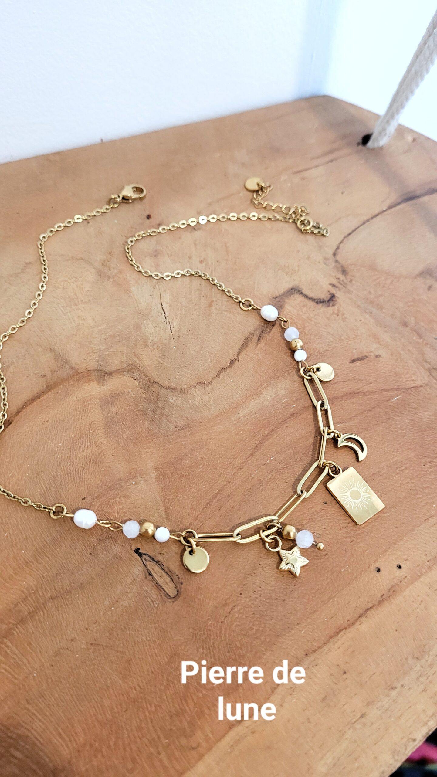 • Pierre de Lune d’Inde (blanc) – pendentifs: médaillon soleil, étoile, strass
