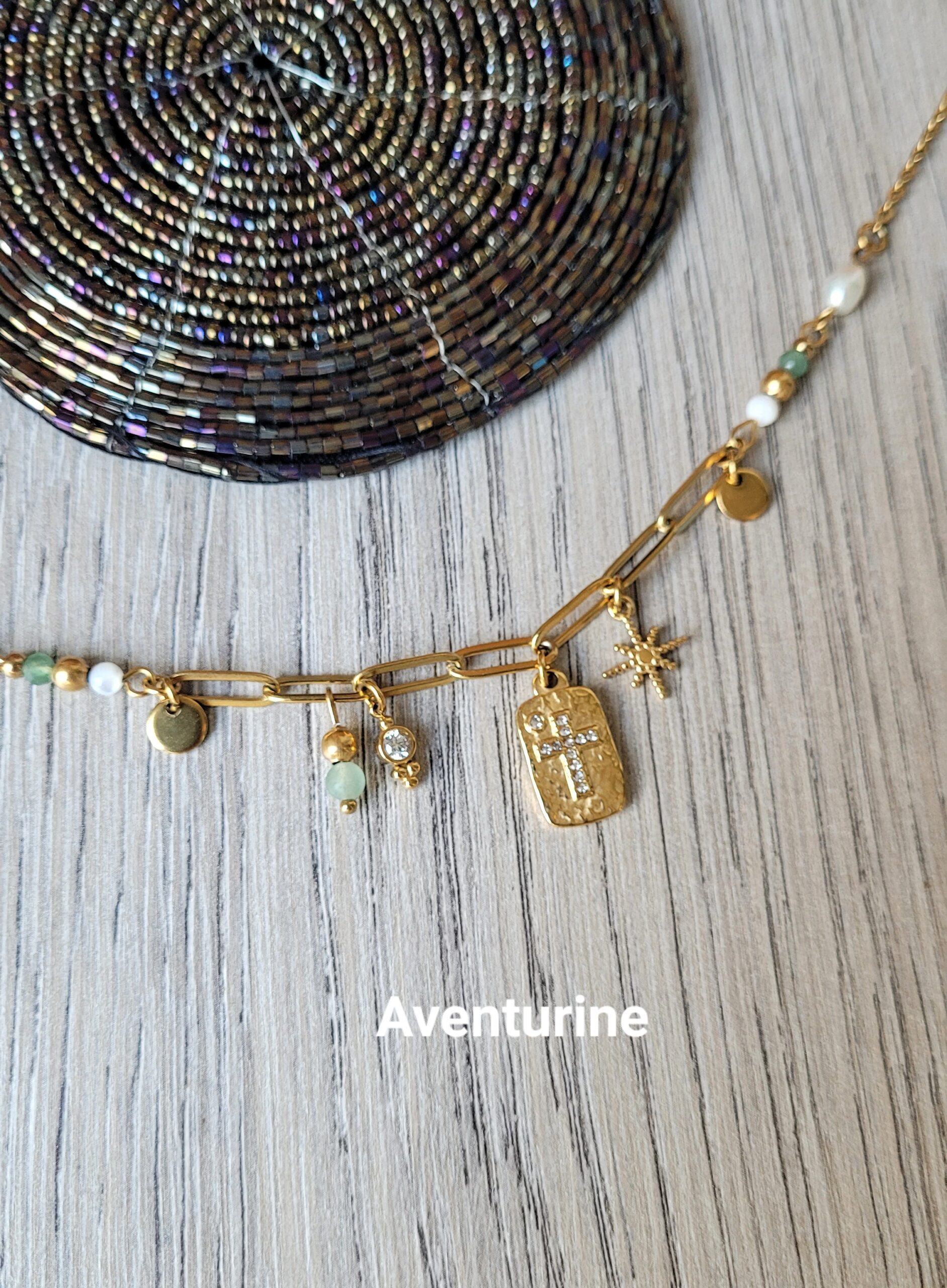 • Aventurine du Brésil (vert clair)  – pendentifs: médaillon croix, étoile du Nord, strass