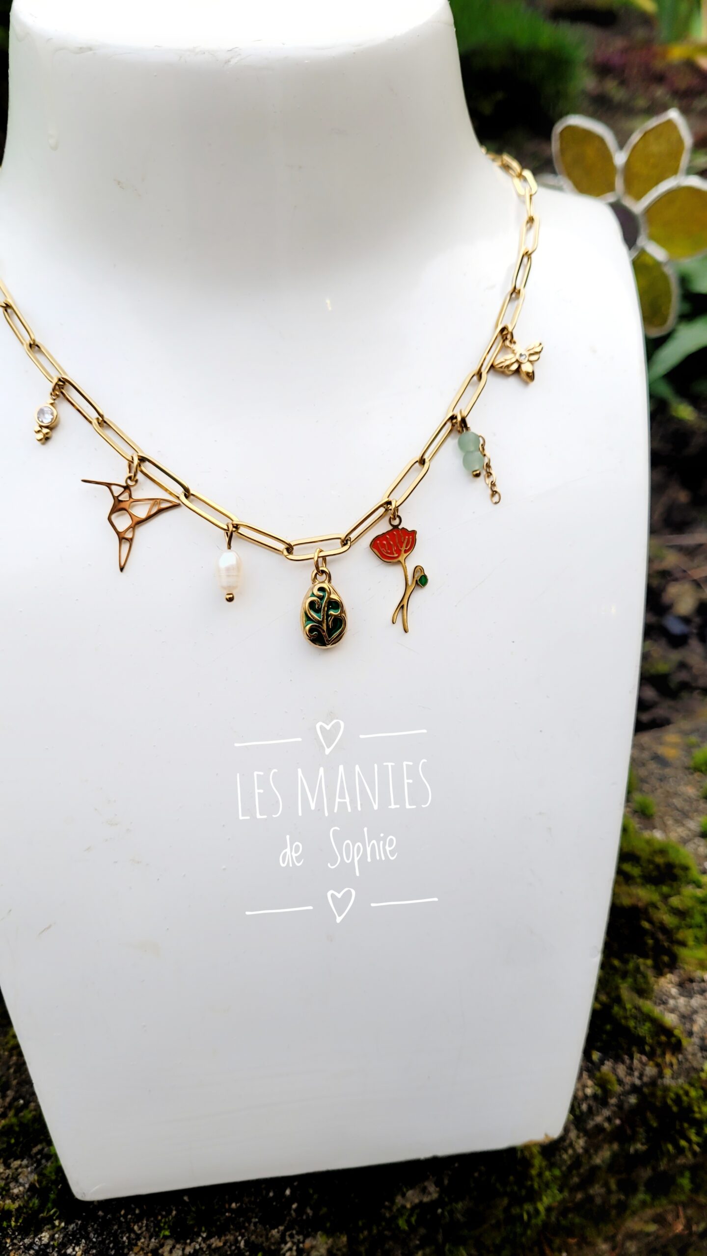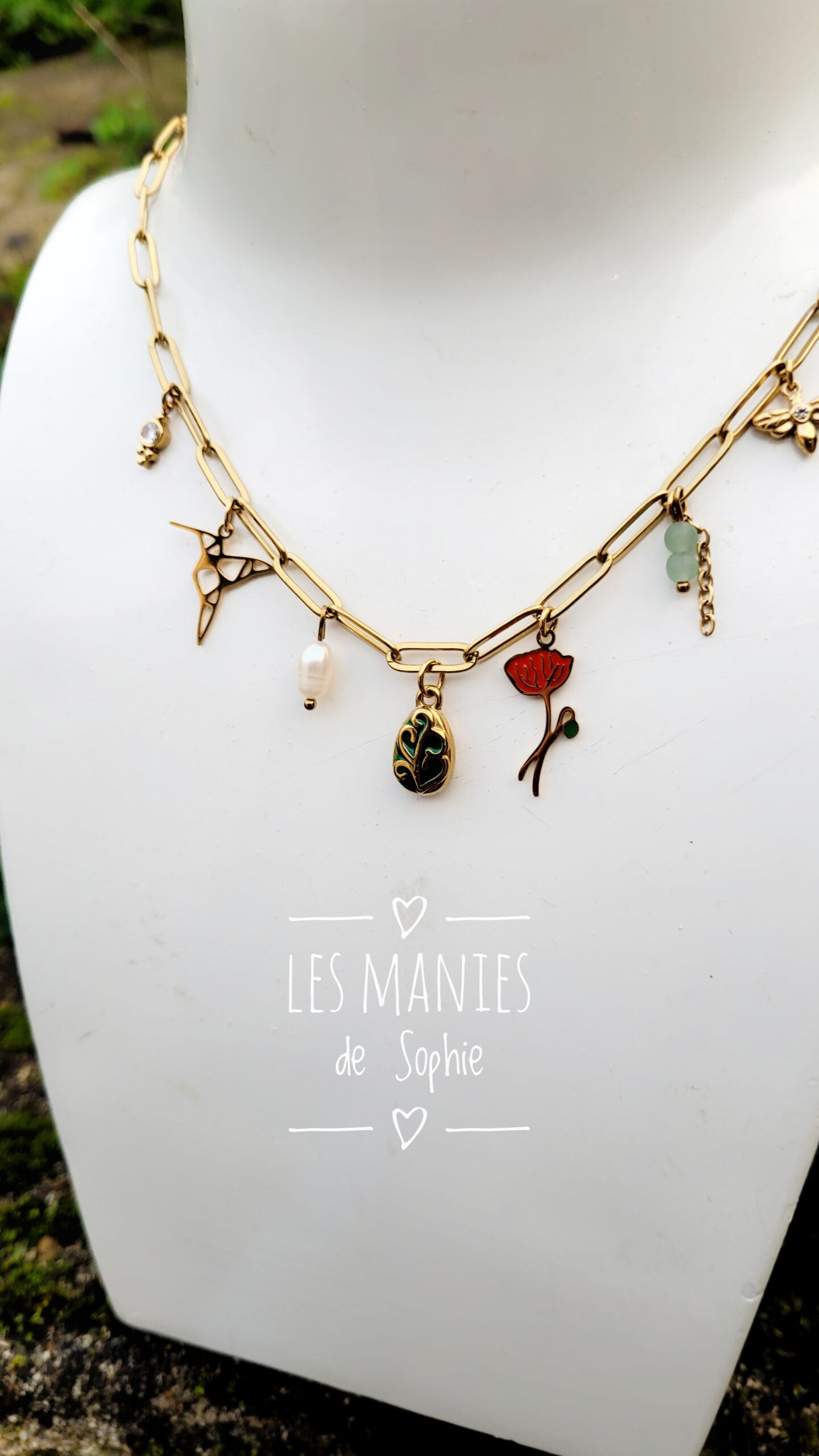 Magnifique collier réalisé à partir d’une chaîne à grosses mailles, de différentes pampilles sur le thème de la nature, d’une perle d’eau douce et d’aventurine du Brésil.