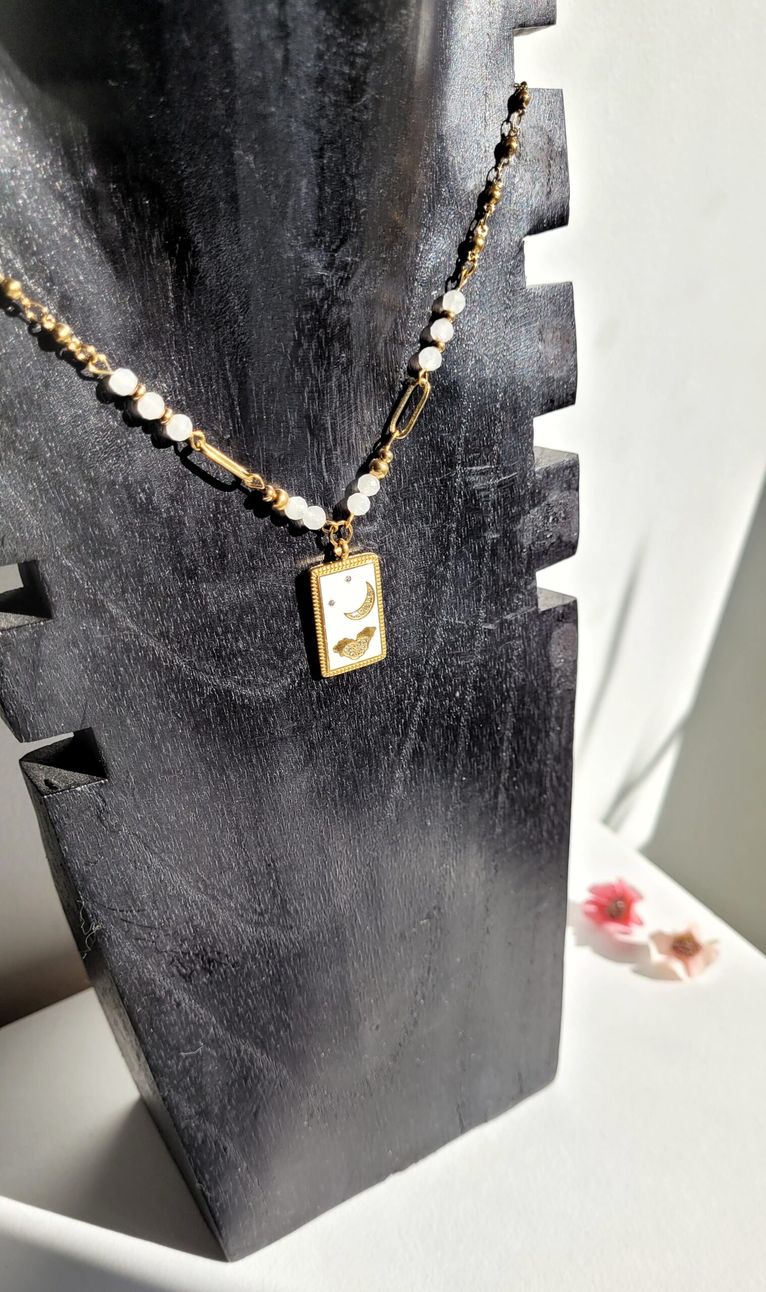 Collier orné d’un pendentif émaillé au thème astral, accompagné de Pierre de Lune (Inde). Une touche lumineuse à porter seul ou en accumulation.