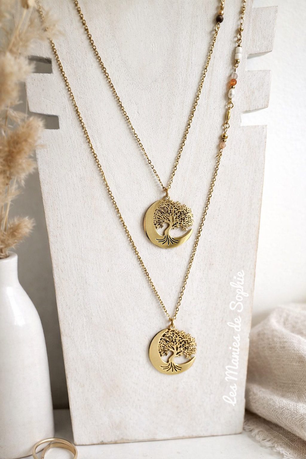 Un seul collier à effet de chaînes superposées, avec un pendentif en forme de soleil turquoise, de pierres naturelles d’Amazonite du Brésil et de petites pampilles dorées. Une pièce unique qui donne l’illusion de plusieurs rangs.